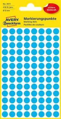 KezdőlapIrodaszerekIrodai papíráruEtikettekEtikett, 8 mm, kör, AVERY ZWECKFORM, kék, 416 etikett/csomag